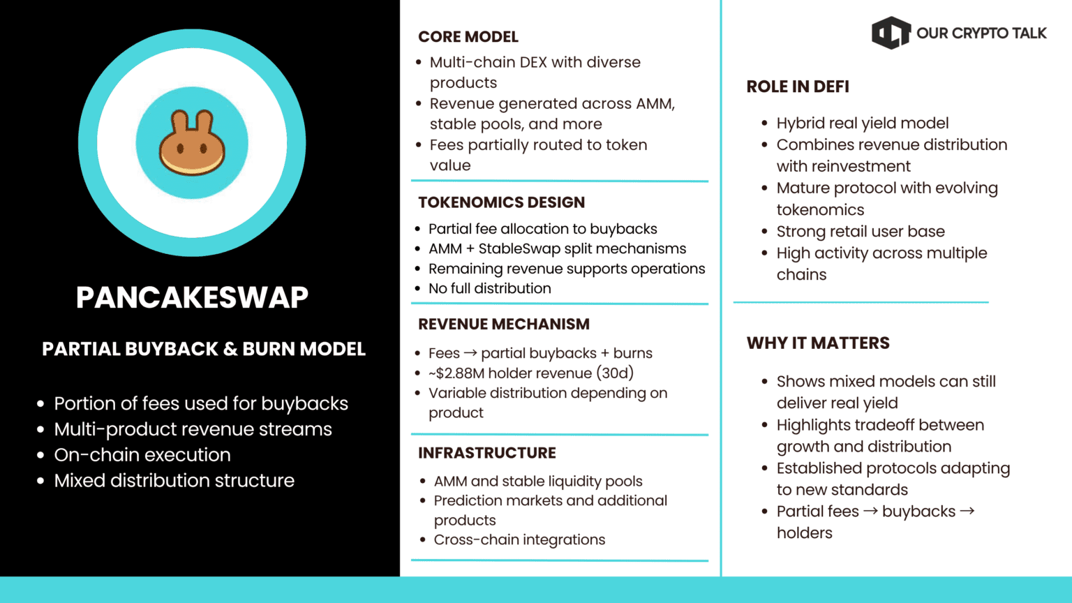 PancakeSwap uses a mixed model. A portion of fees is used for buybacks and burns, while the rest supports operations. The mechanism is verifiable but not fully distributed.
