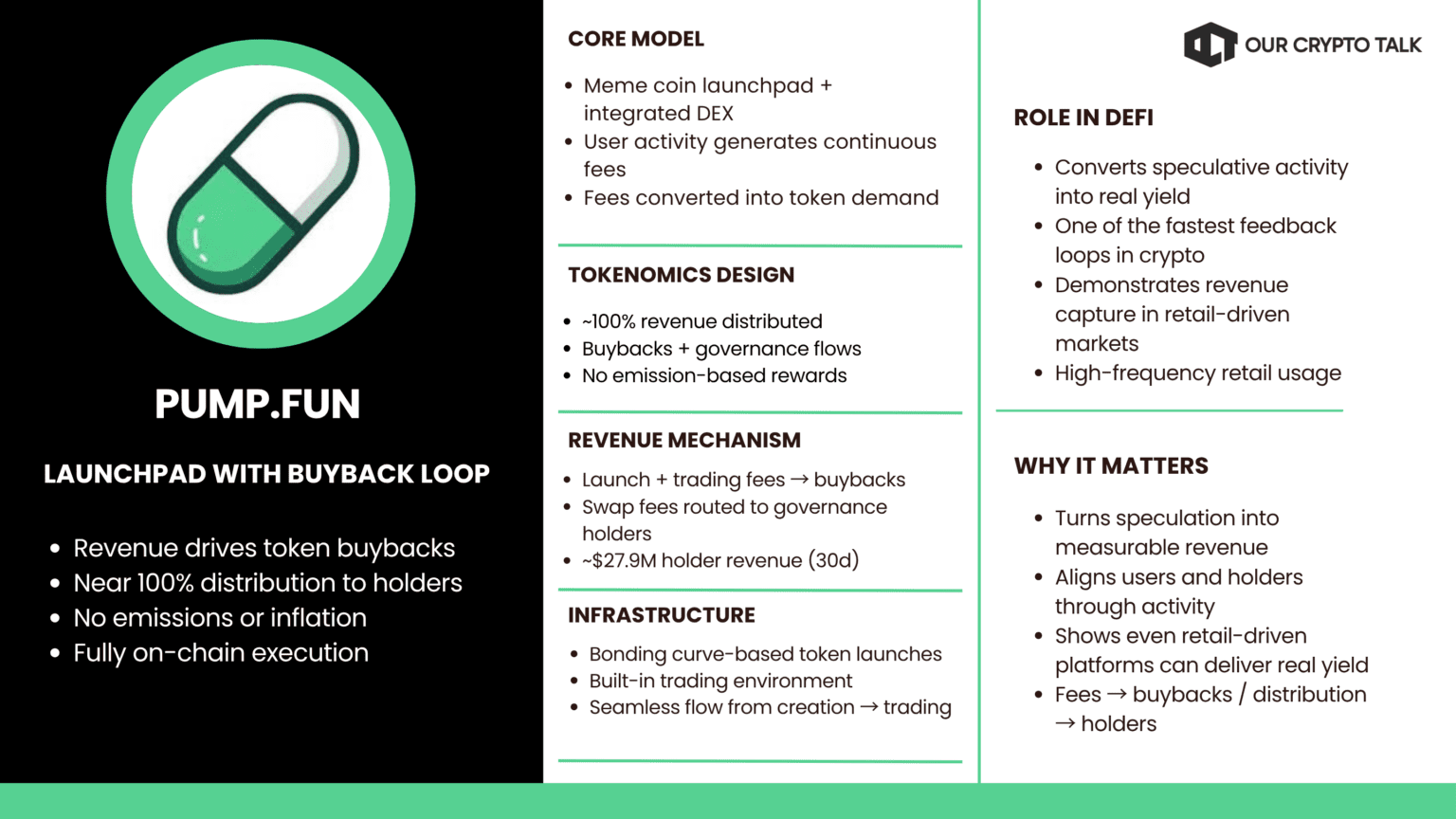 Pump functions as a launchpad with integrated trading. Revenue is routed into token buybacks and governance distribution. The mechanism is close to full distribution and happens on-chain. There is no reliance on emissions.