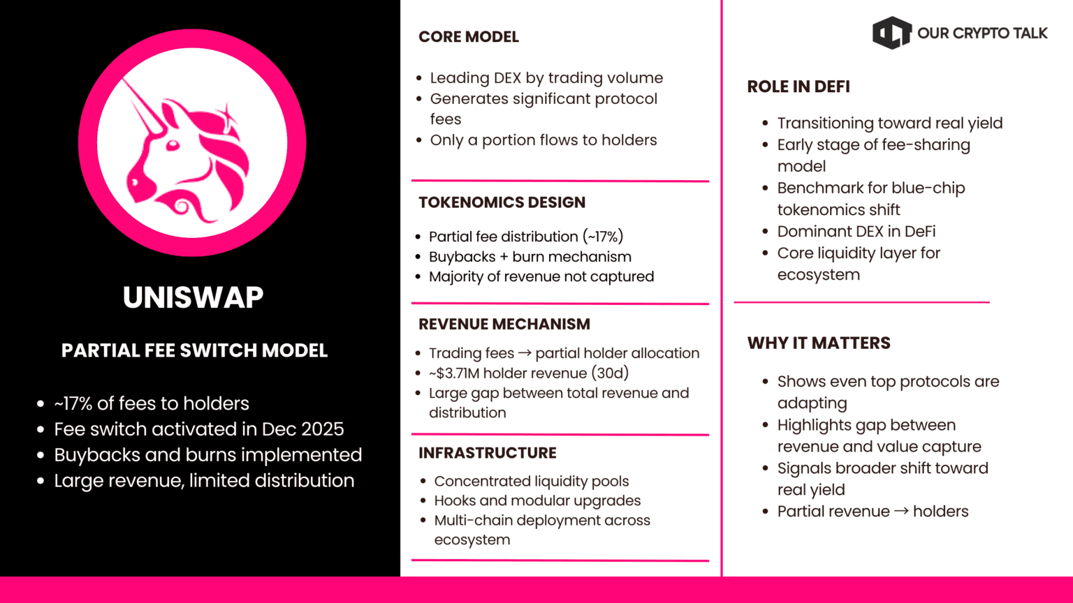 Uniswap introduced its fee switch after years of delay. A portion of trading fees now goes to UNI holders. The current distribution is around 17%. This is a meaningful shift but still limited.