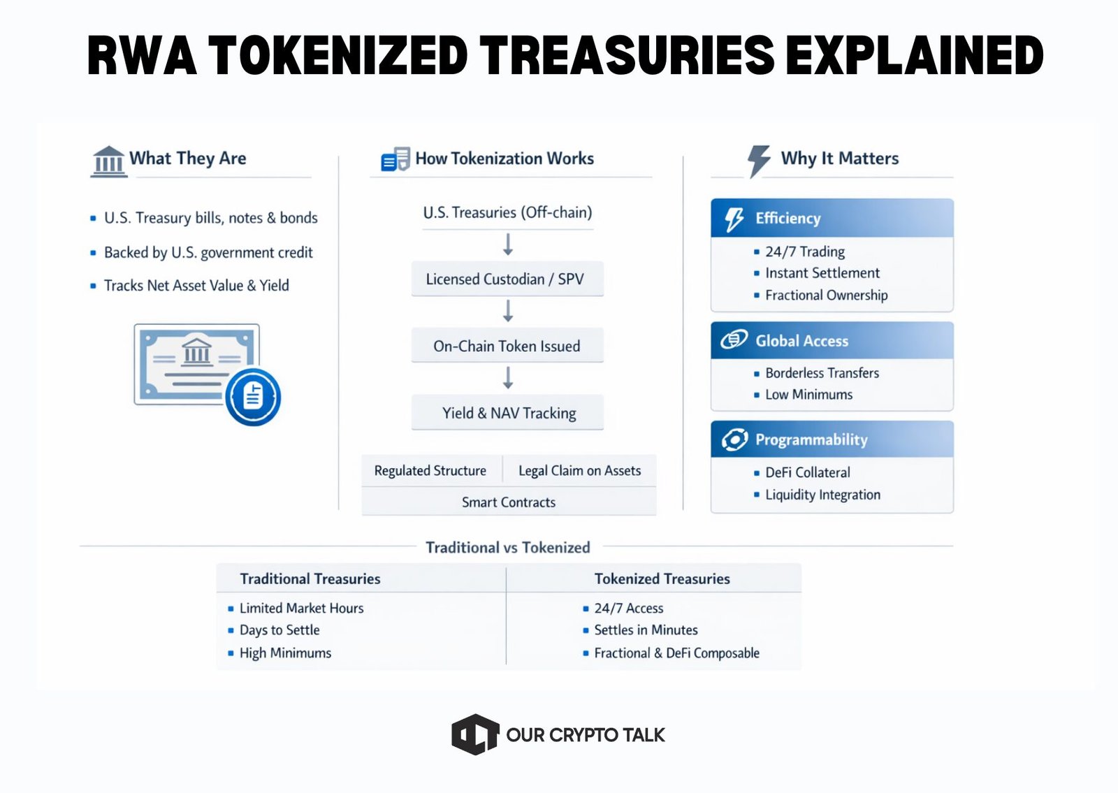 RWA tokenized treasuries explained. Learn how on-chain U.S. Treasuries deliver stable yield, DeFi composability, risks, and future growth.