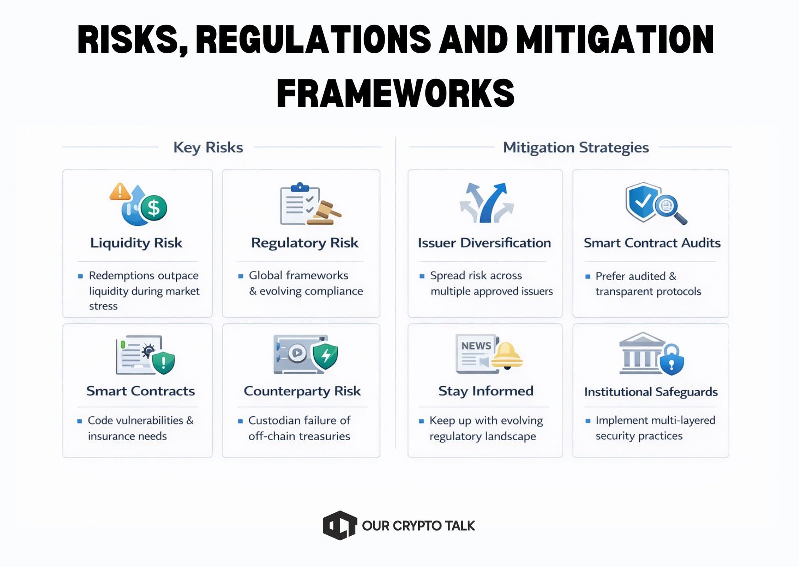 Despite their appeal, RWA tokenized treasuries are not risk-free. Liquidity risk can emerge during periods of market stress if redemptions outpace available liquidity. Regulatory risk remains significant, especially as global reporting frameworks like the Crypto Asset Reporting Framework come into effect.