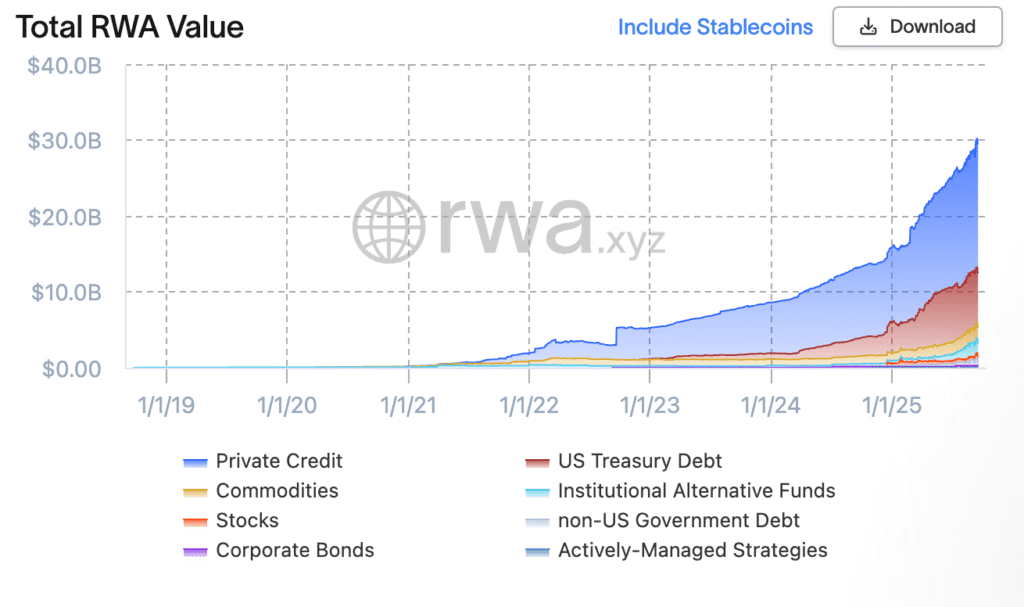 Total tokenized RWA value expands from roughly $15B to over $30B, with tokenized treasuries driving growth due to yield appeal and low volatility.