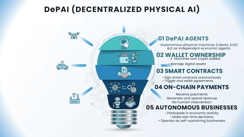 In practical terms, DePAI refers to autonomous physical machines such as robots, and autonomous vehicles that operate as independent economic agents on blockchain networks. Therefore, These machines can own wallets, sign smart contracts, receive payments, generate revenue, and spend crypto assets without any human intervention.