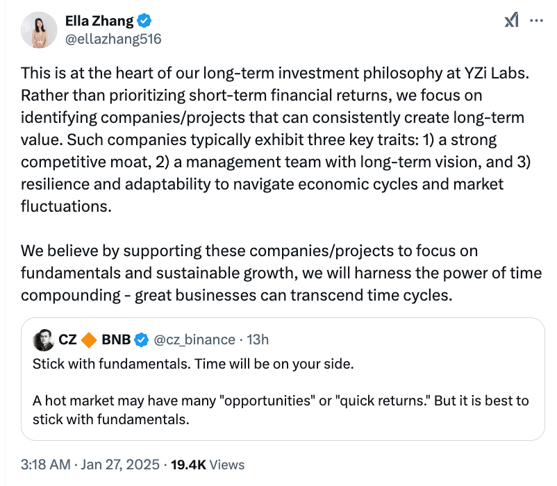 Ella Zhang, who had led Binance Labs in its early years, returned to lead YZi Labs. This brought consistency in leadership and mission. She clarified that although the name had changed, the mission remained the same: to support transformative technology. Now, the vision was broader. The new goal was to bridge Web3 with AI and biotech and push the boundaries of innovation.