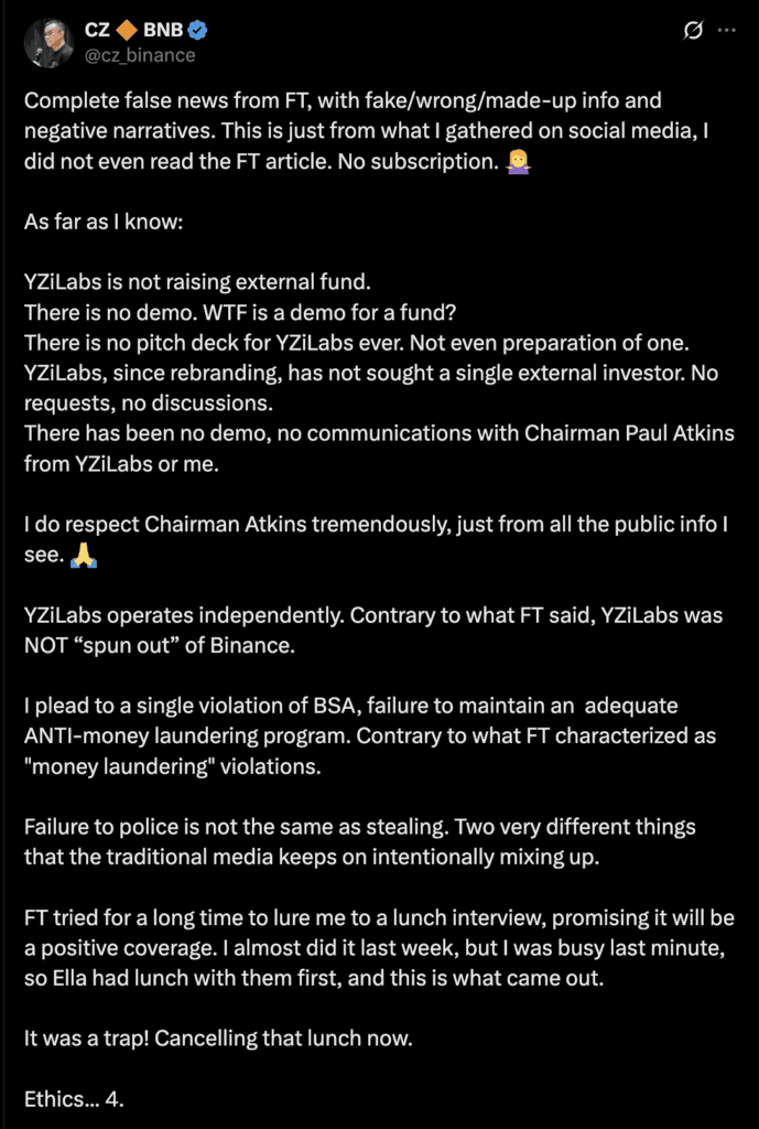 CZ responded quickly and strongly. He publicly labeled the article as false. In a direct rebuttal, he clarified that YZi Labs is a private family office funded by his personal wealth. He stated that there was no demo, pitch deck, or roadmap prepared for external investors. Furthermore, he emphasized that the firm had not approached a single investor or regulator about fundraising since the rebrand. CZ also criticized the Financial Times for spreading misinformation and negative narratives. Interestingly, he admitted that he had not read the article himself due to its paywall. He was alerted by discussions in the community.