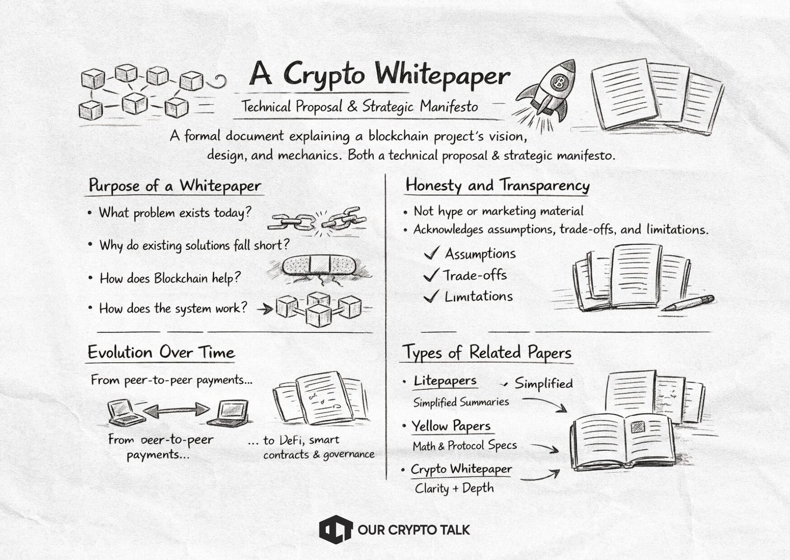 - A crypto whitepaper is the foundational document explaining a project’s vision, design, and economics.