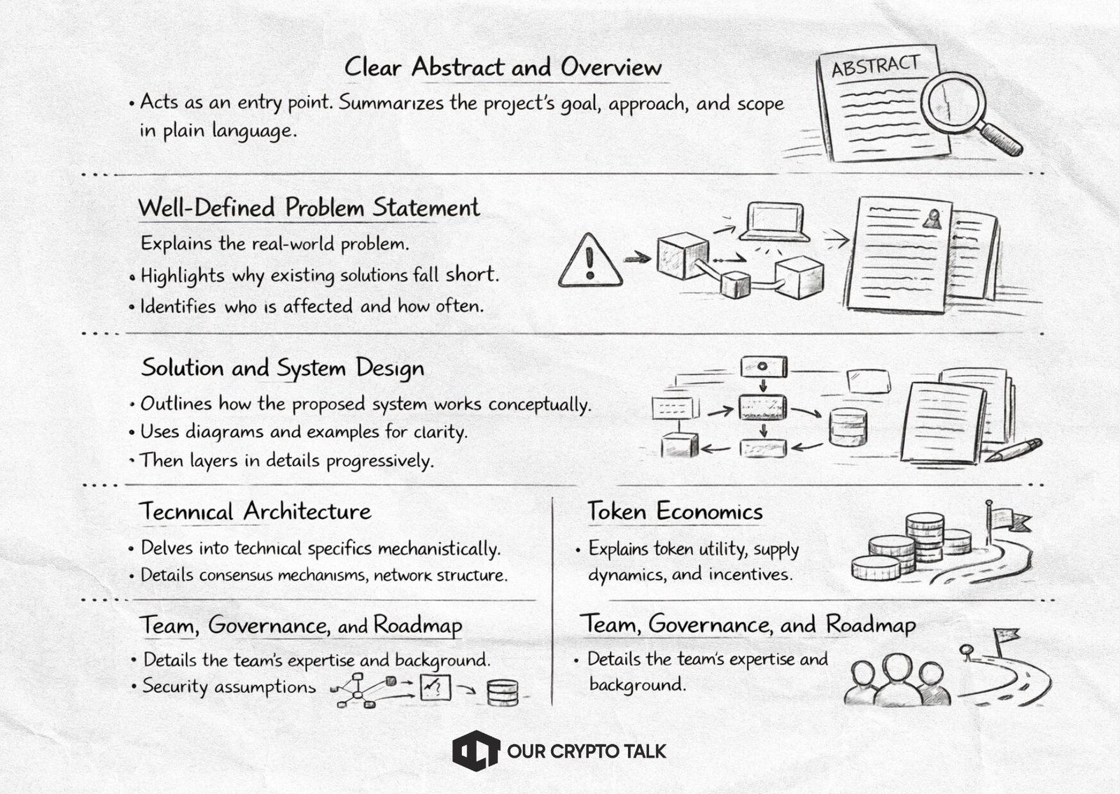 While formats vary, most high-quality Crypto Whitepapers share a common structural backbone. Understanding these components makes evaluation far easier.