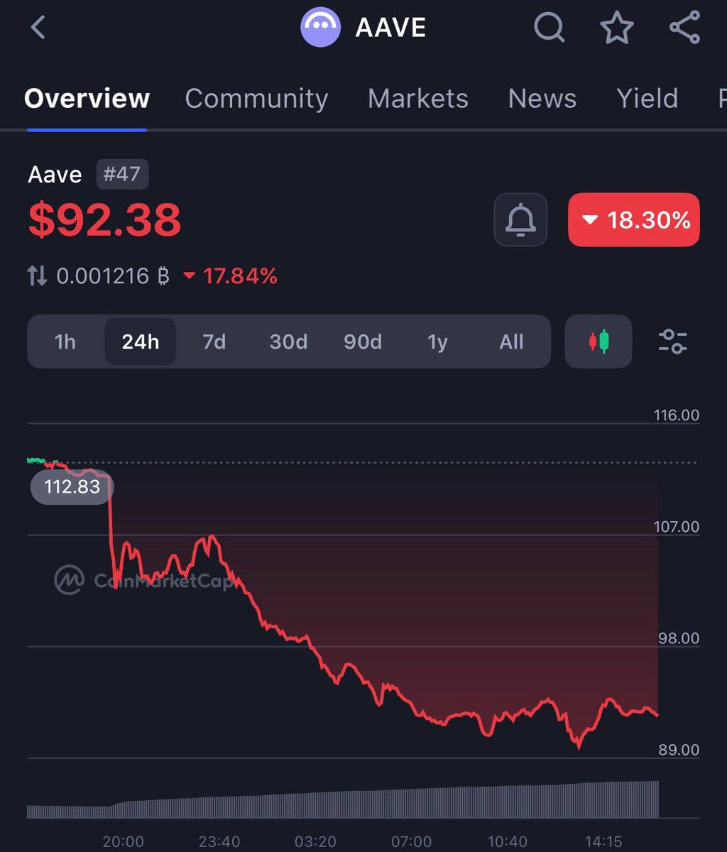 The AAVE token price fell between 12% and 20%. Most reports cite a decline of 16-19%.