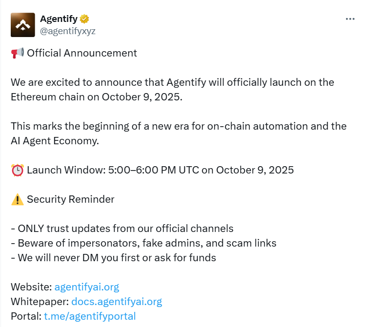 Alongside the launch announcement, Agentify issued a public advisory warning users to rely solely on verified links and avoid impersonators or fraudulent DMs. This comes amid an uptick in AI-related crypto scams Chainalysis estimates over $1 billion lost to such schemes in 2024. The team stated, “We will never DM you first or ask for funds,” underscoring its security-first philosophy.