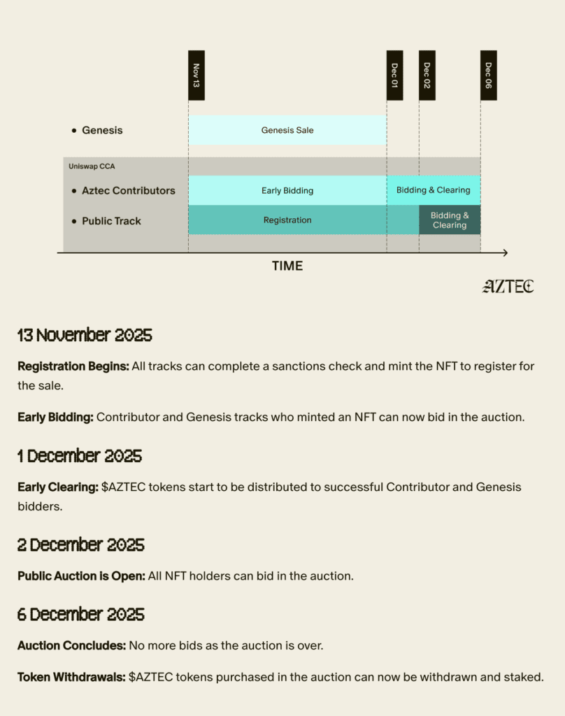 The $AZTEC token sale kicked off on November 13, 2025, using a novel sale format called the Continuous Clearing Auction (CCA) – a real-time bidding system developed by Uniswap. Unlike traditional launches, this one includes no VC allocations or airdrops. Instead, 100% of the proceeds go to the Aztec Foundation.