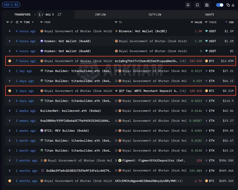 As Bitcoin hits record prices, Bhutan moves over 1,300 BTC to exchanges and new wallets, likely for liquidation.