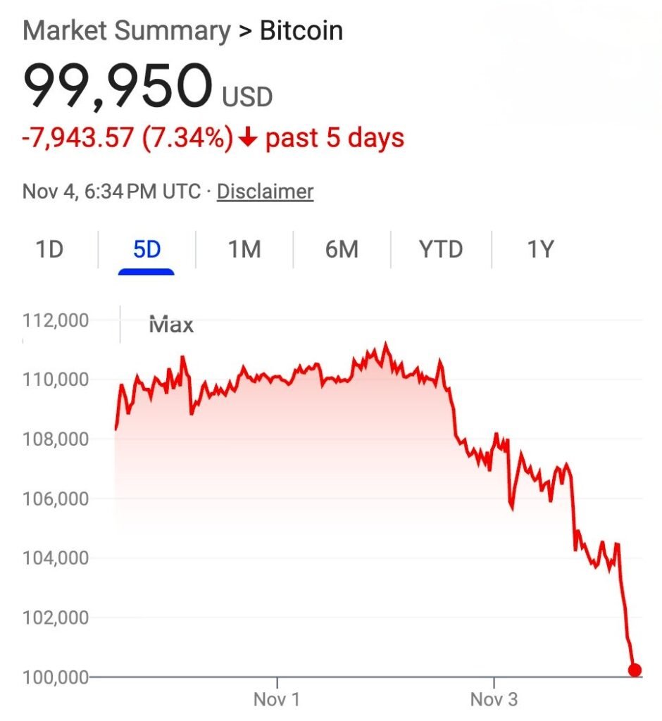 November 5, 2025 – Bitcoin (BTC) has fallen below the $100,000 mark for the first time since June, ending a 135-day streak above this critical psychological threshold. The world’s largest cryptocurrency plunged to $99,800, down 6% in 24 hours and 12% from last week’s high of $115,966.