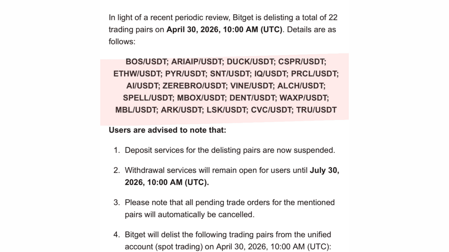 25th April 2026 – Bitget will delist 22 spot trading pairs from its platform on April 30, 2026, after completing a periodic review of listed assets.