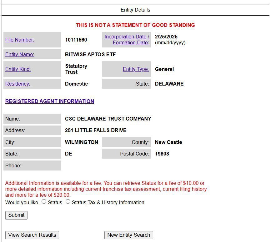 Bitwise Asset Management has filed for an Aptos (APT) Exchange-Traded Fund (ETF) in Delaware, signaling a potential push for a spot Aptos ETF in the U.S. If approved, this would mark the first U.S.-based ETF holding APT tokens directly.