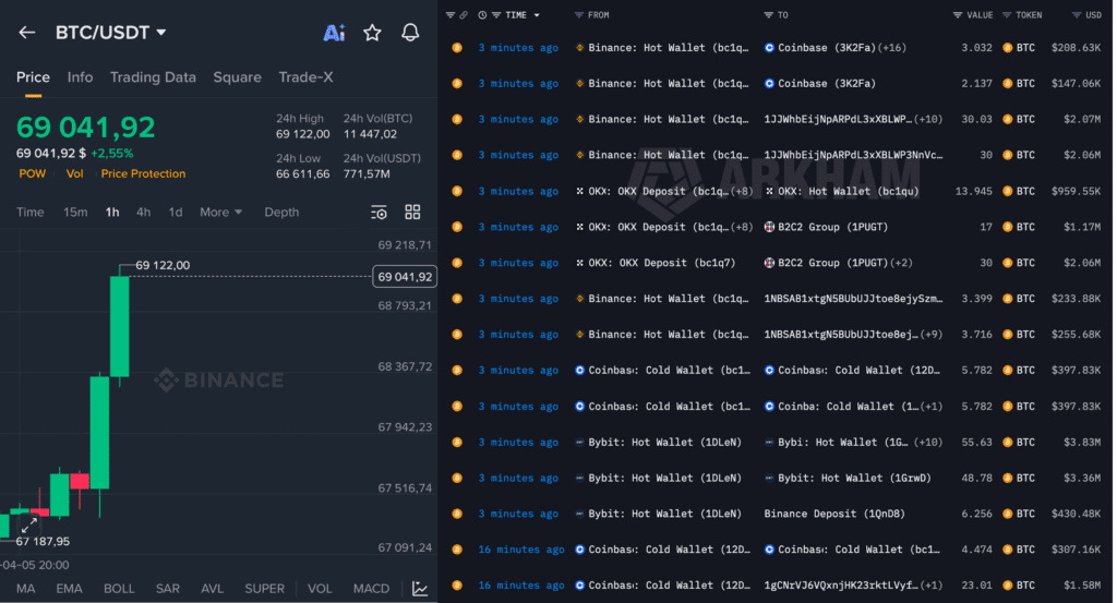 BTC pumped into the $69,000 zone on Sunday evening amid broader risk-on sentiment. That price move attracted attention to the exchange flows, which were already in motion. Traders and social media accounts then connected the dots. In their view, potential de-escalation leads to lower geopolitical risk. That could be bullish for BTC.