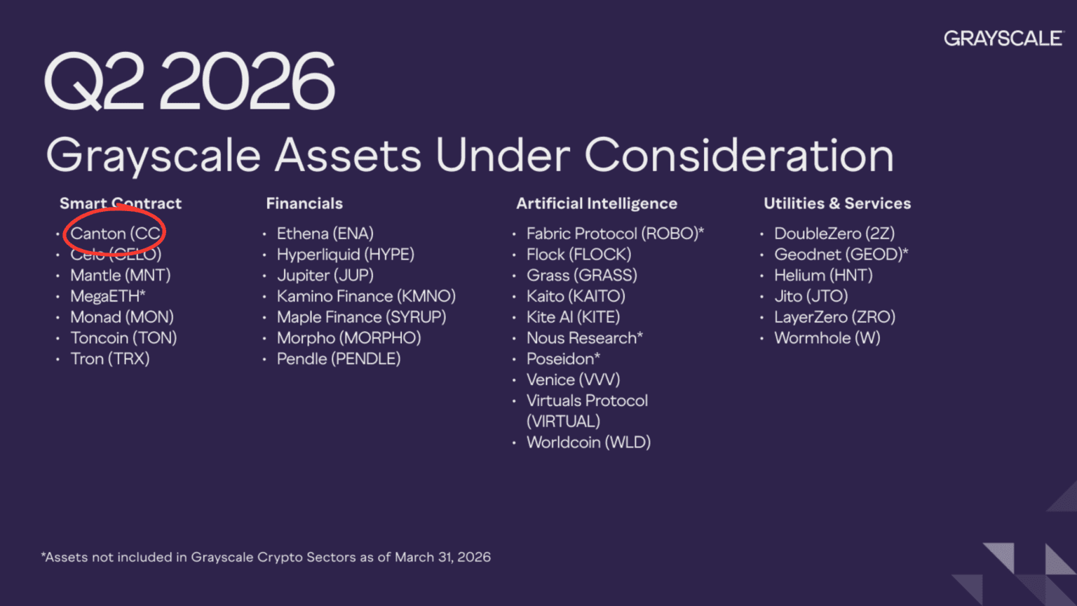 At the same time, Grayscale added Canton’s native token $CC to its Assets Under Consideration list for Q2 2026. This signals potential interest in future investment products tied to the network.