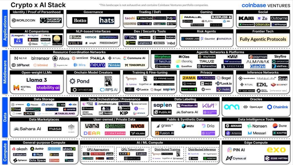 Coinbase's latest report details the Crypto x AI stack, exploring layers like compute, data, middleware, and applications for a Ai ecosystem.
