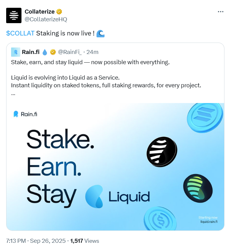 September 26, 2025 — Collaterize has announced the official launch of $COLLAT staking on Rain.fi, integrating its Real World Asset (RWA) ecosystem with Rain.fi’s lending protocol on Solana. The rollout introduces Liquid as a Service, enabling token holders to earn staking rewards while retaining instant liquidity through stCOLLAT, a liquid staked version of $COLLAT.