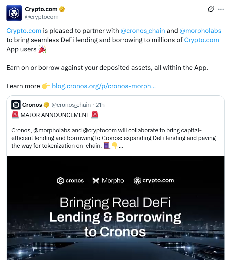 October 3, 2025 — Crypto.com has announced the integration of the Morpho lending protocol into the Cronos blockchain, allowing users to earn yield on stablecoins by depositing wrapped ETH and BTC. The move mirrors Coinbase’s recent adoption of Morpho and underscores a growing trend among exchanges seeking to bring DeFi lending directly into user platforms.