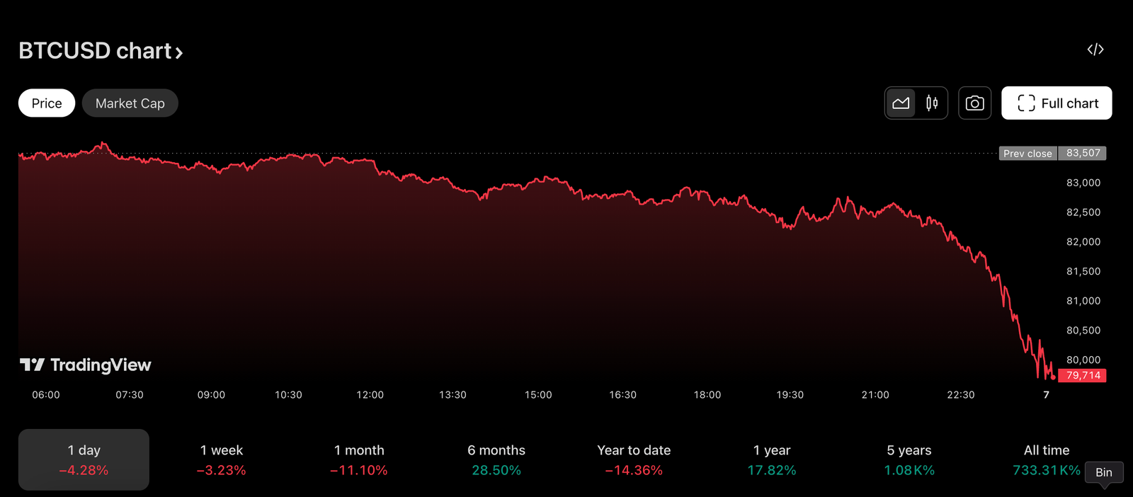 April 6, 2025 — The crypto market took a severe hit late Sunday night, as Bitcoin (BTC) crash below $80,000, currently trading near $79,500, and Ethereum (ETH) fell under $1,700, marking its lowest point since August 2023. The sharp downturn wiped billions from the total market cap, now sitting just below $2.5 trillion, and sent shockwaves across the digital asset space.