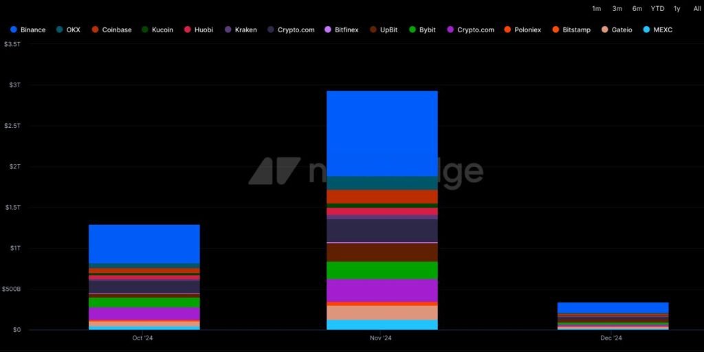 Nov marked a milestone in cryptocurrency trading, with monthly exchange volumes soaring to $2.9 trillion, the highest level since May 2021