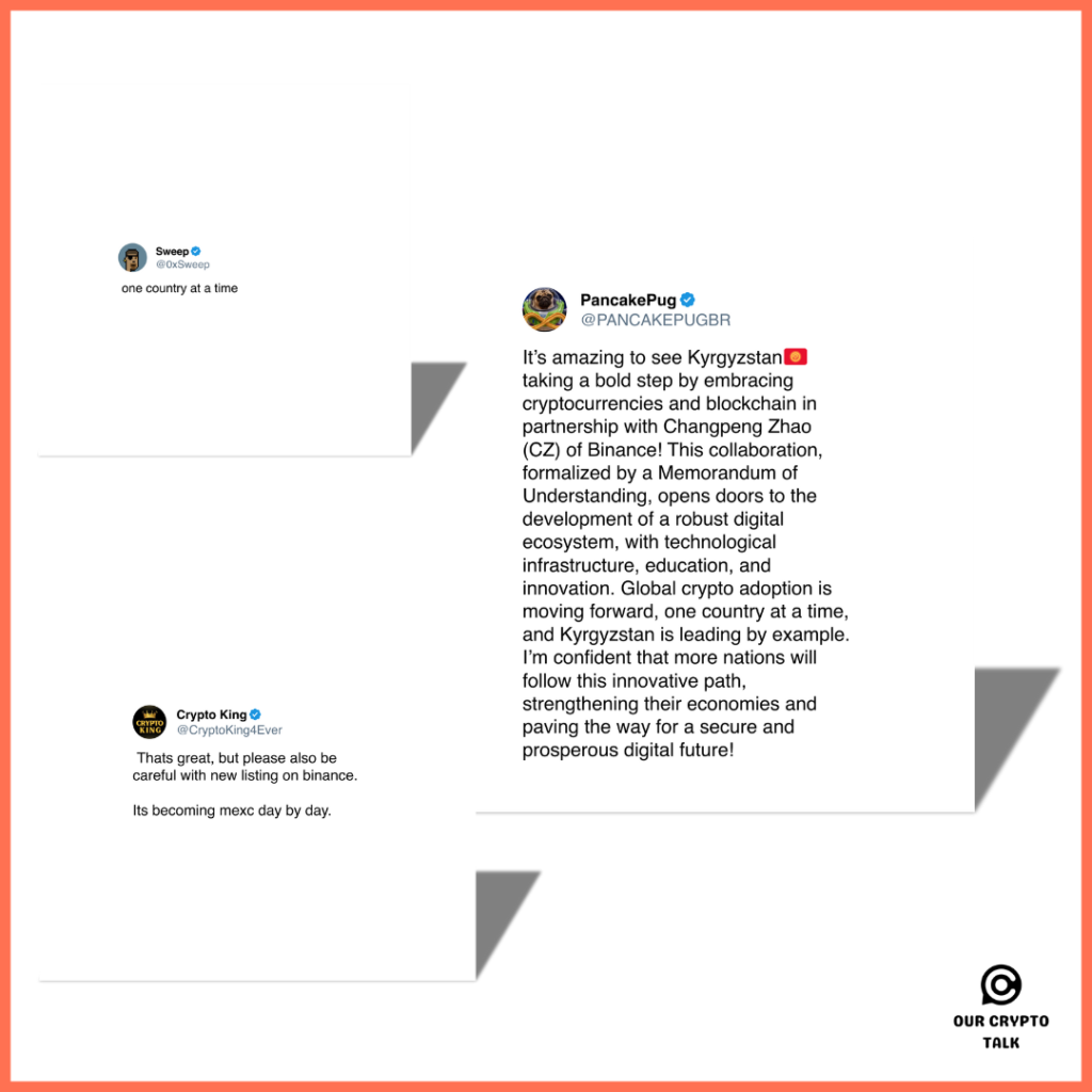 CZ signed a Memorandum of Understanding (MoU) with the Kyrgyz National Investment Agency (NIA) to collaborate on building the nation’s Web3 capacities. The partnership involves offering technical expertise, consulting on blockchain solutions, and promoting the adoption of crypto technologies in Kyrgyzstan.