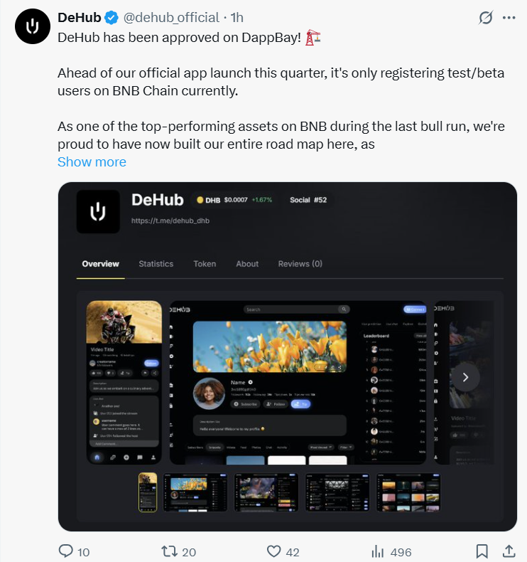 The DeHub DappBay Listing validates DeHub as an official part of the BNB Chain ecosystem. Since first launching on BNB in 2021, the platform has sought deeper adoption, and DappBay provides an official gateway to reach millions of active users.