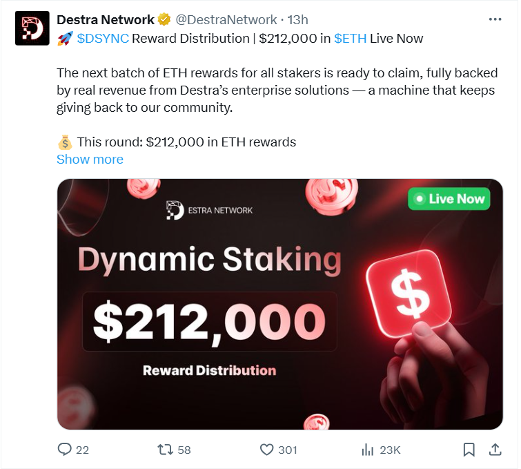 Destra confirmed the latest rewards round is ready to claim and funded by real revenue from its enterprise solutions. The model aims to deliver consistent, transparent payouts rather than speculative emissions.