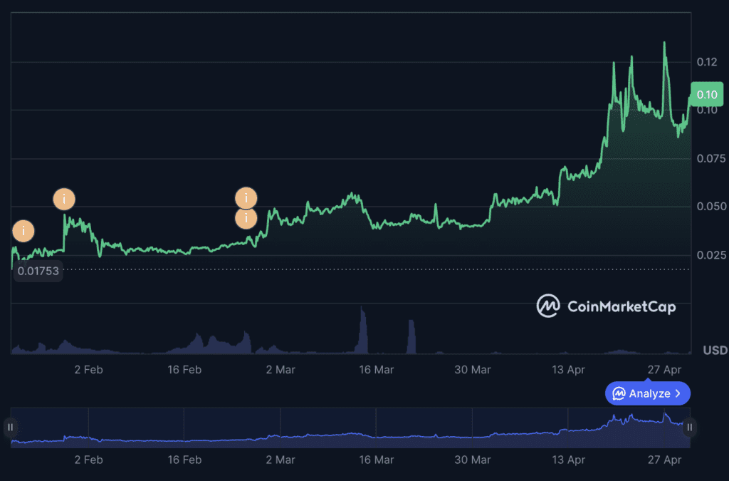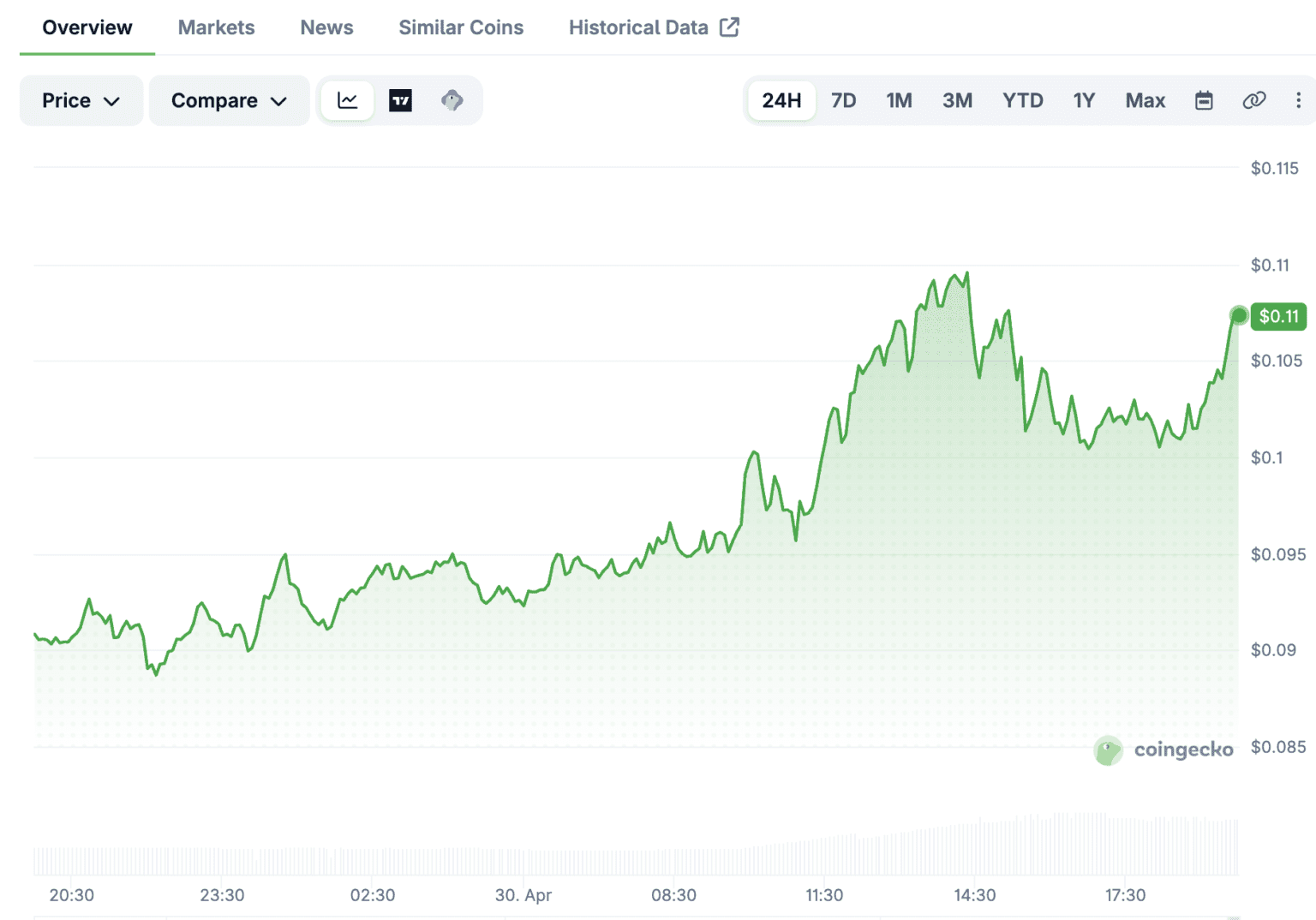 The immediate resistance zone sits around $0.11 to $0.112. This is based on the psychological round-number area and the recent swing high from the April 26 all-time-high zone, according to TradingView chart data cited in the research. The key support level sits near $0.093. This matches the 24-hour low zone and the prior breakout base from the April 28 to 29 consolidation. The next major historical level is $0.1367. This is based on the April 26, 2026 all-time high and is included only as a historical reference point.