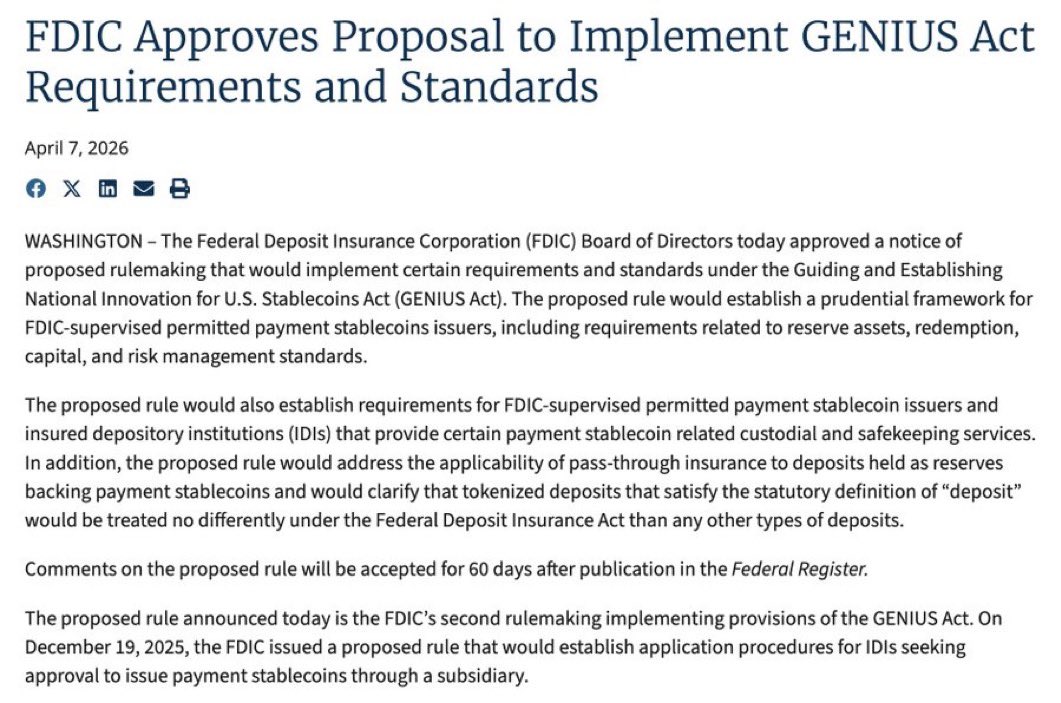 8th April 2026- In a major step toward bringing stablecoins into the regulated banking system, the Federal Deposit Insurance Corporation (FDIC) on April 7, 2026, approved a proposed rulemaking that establishes the first comprehensive federal prudential framework for payment stablecoin issuers under the Guiding and Establishing National Innovation for U.S. Stablecoins (GENIUS) Act. The FDIC stablecoin rules mark the first comprehensive federal prudential framework for payment stablecoin issuers under the GENIUS Act.