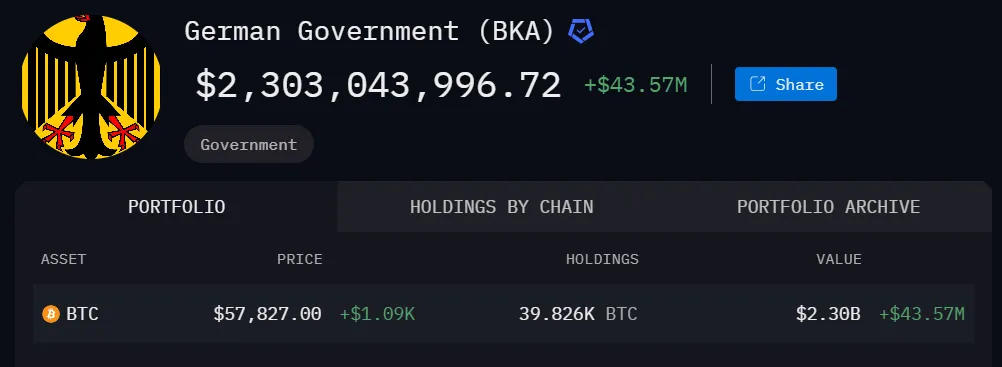 The German government began transferring Bitcoin to exchanges like Coinbase, Bitstamp, and Kraken last month. This followed the seizure of 50,000 BTC from the film piracy site Movie2k earlier this year. Blockchain analytic platform Lookonchain noted that Germany has made a BTC transfer every day this month. These actions reduced its holdings to 39,826 BTC, valued at around $2.3 billion.