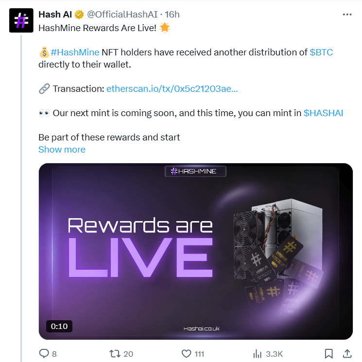 September 29, 2025 — Hash AI has completed its latest distribution of HashMine Bitcoin rewards to NFT holders, reinforcing its position as a frontrunner in the tokenized mining space. The reward drop, confirmed via a verified Ethereum transaction on September 28, highlights the project’s blend of AI-driven mining optimization and fractionalized ownership through NFTs.