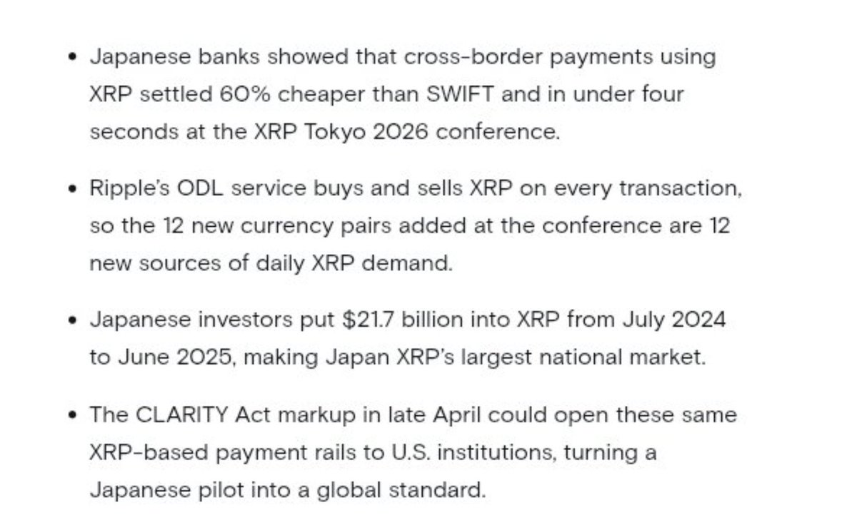 13th April 2026 – Japanese financial institutions presented live pilot data at XRP Tokyo 2026. The results showed XRP cross-border payments settling in under 4 seconds at up to 60% lower cost than traditional SWIFT transfers.