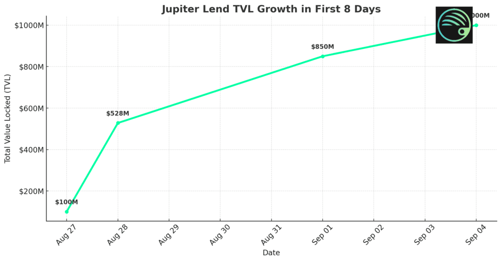 Jupiter Lend reached $100 million in deposits within its first hour. On day two, total value locked (TVL) had exceeded $528 million, and 4,600+ borrowing positions had been created. By September 1, the platform had grown to $850 million , putting it in second place on Solana behind Kamino Finance.