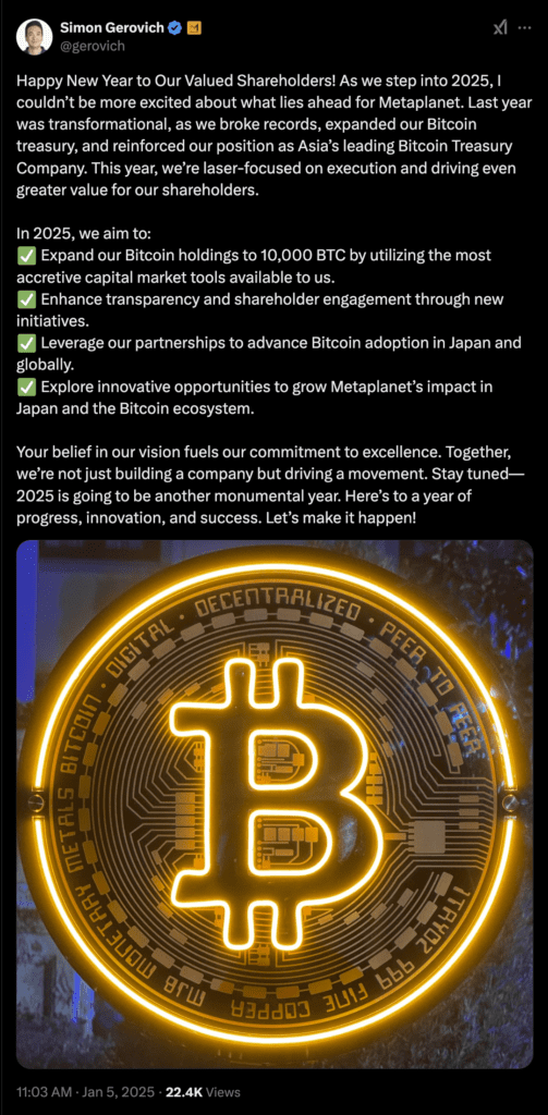 Metaplanet Inc. plans to increase its Bitcoin holdings by 470%, aiming to reach 10,000 BTC this year after a successful 2024.