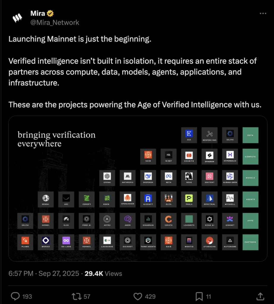 Mira has also integrated with existing tools and platforms. Apps like Klok AI, GigabrainGG, and ElizaOS already use Mira for verification. The network collaborates with over 25 partners, including SendAI, Zerepy, Monad, and io.net.