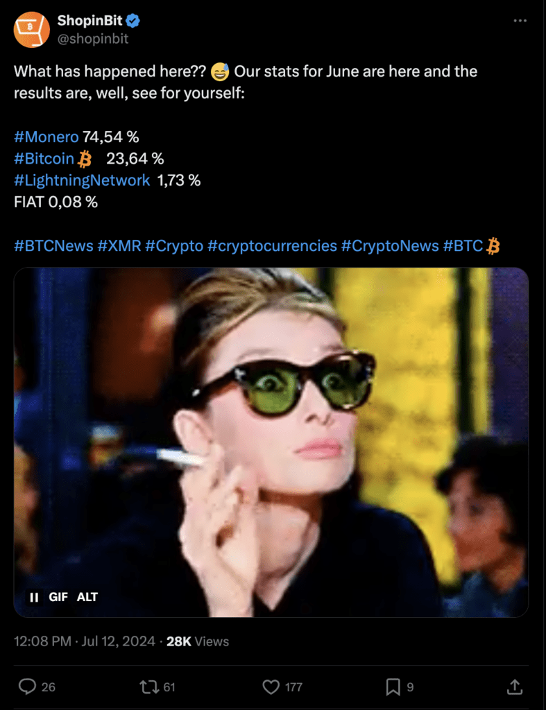 According to Shopinbit, a European online retailer that accepts cryptocurrency for transactions, Monero ($XMR) was the favored payment method in June. Shopinbit reported that XMR accounted for over 74% of all payments during that period.
