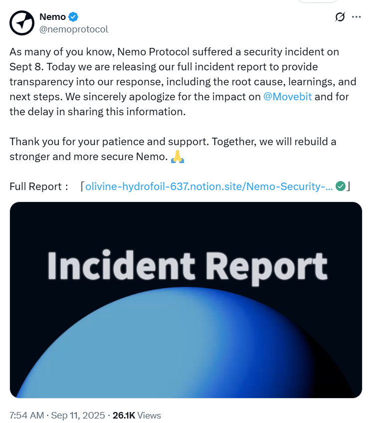 September 11, 2025 — Yield trading protocol Nemo, built on the Sui blockchain, has admitted that an exploit draining $2.59 million could have been prevented if its team had acted on an auditor’s warning. The September 7 Nemo hack stemmed from unaudited code deployed without proper multisignature protections.