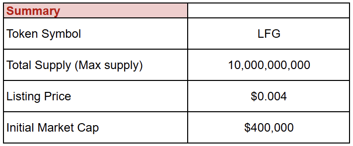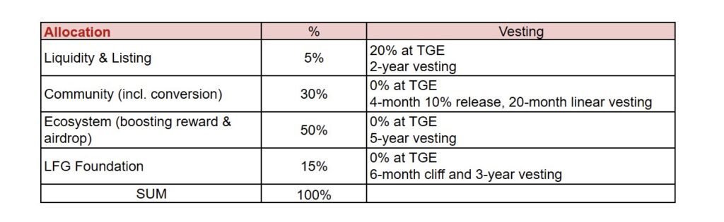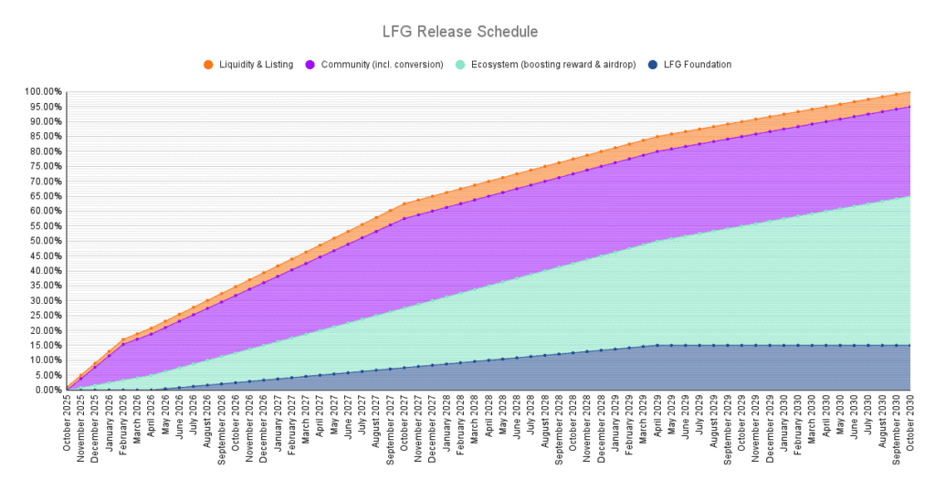 $LFG’s TGE is expected in October. The circulating supply at launch will be under 6%. There’s no team-specific allocation; all vesting follows multi-year schedules aligned with product growth and community development.