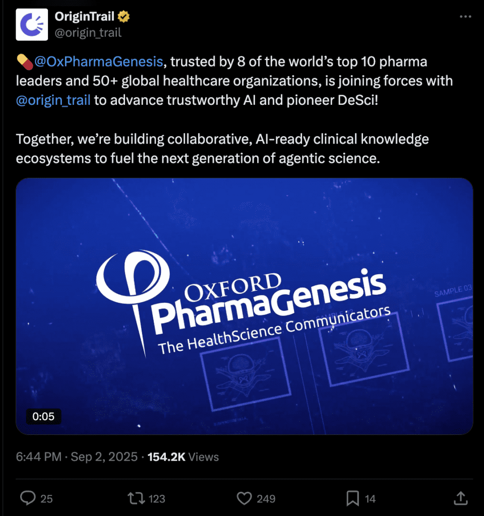 The partnership builds on OriginTrail’s past work in pharma, such as its projects with BSI and the Sustainable Medicines Partnership. It also expands Oxford PharmaGenesis’s efforts to increase transparency in medical research.