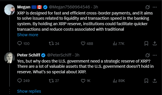 On the other hand, XRP supporters were quick to challenge Schiff’s criticism, arguing that XRP’s efficiency in cross-border payments justifies its reserve potential. One user emphasized its role in improving banking liquidity, while Schiff pushed back, questioning why the U.S. government would need XRP reserves when other valuable assets aren’t treated the same way.