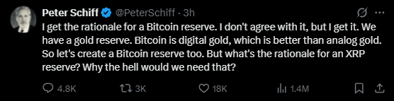 Peter Schiff’s comments on XRP and Bitcoin reserves have sparked a heated debate across social media. His acknowledgment of Bitcoin as “digital gold” caught many by surprise, given his history of skepticism toward crypto. Some in the Bitcoin community saw this as a subtle shift in his stance, while others dismissed it as sarcasm.