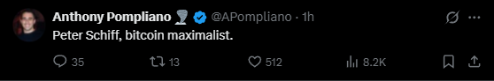 Anthony Pompliano even weighed in, jokingly calling Schiff a “Bitcoin maximalist,” further fueling the conversation.