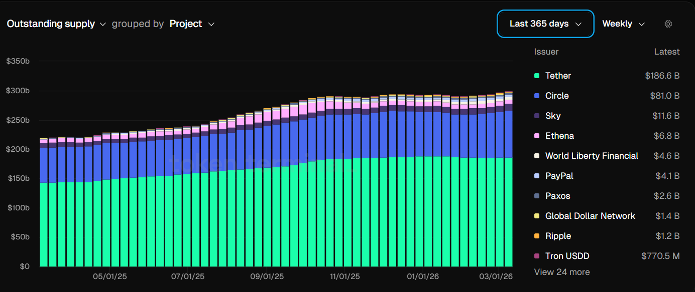 One reason Polymarket users bet on Ethereum losing second place is the rapid expansion of stablecoins. Tether’s USDT stablecoin has grown significantly in circulation as traders and institutions increasingly use dollar-pegged assets for payments, trading liquidity, and cross-border transfers.