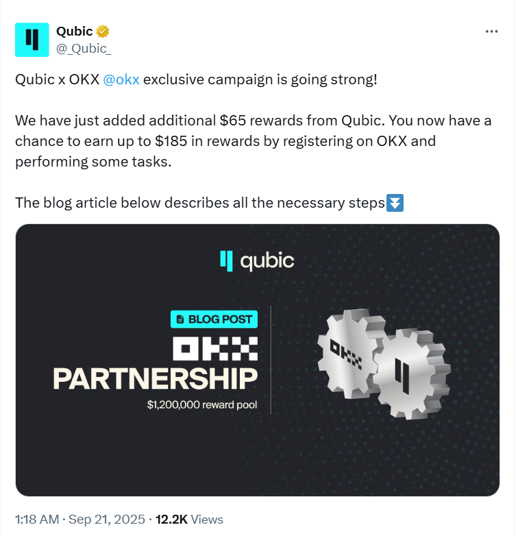 Qubic x OKX Listing Rewards Campaign offers $1.2M in incentives, with users earning up to $185 while supporting a QUBIC/USDT listing.