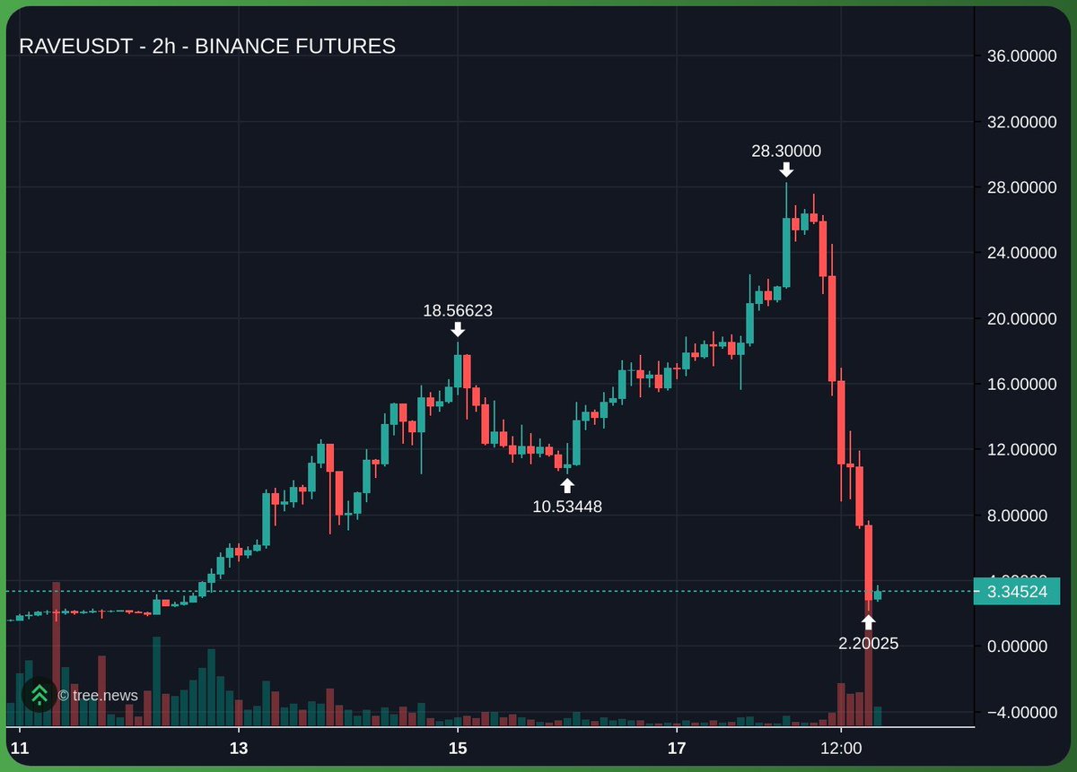 The unwind was fast. RAVE hit its all-time high near $28 on April 17-18. Then it dropped over 51% from ATH within hours. The full cascade brought the price down 86-94%, depending on the exchange, to lows around $1.94-$2.81.