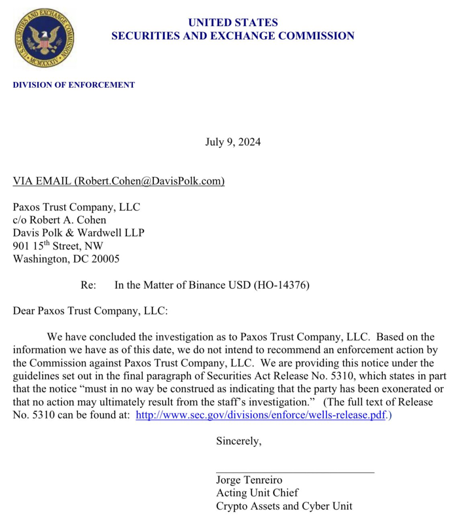 On July 9, Jorge Tenreiro, acting chief of the SEC’s crypto assets and cyber unit, informed Paxos that he would not recommend enforcement action, according to a letter obtained by Fortune. This conclusion came more than a year after Paxos received a Wells notice from the SEC, indicating a possible enforcement action regarding the BUSD stablecoin issued in collaboration with Binance.