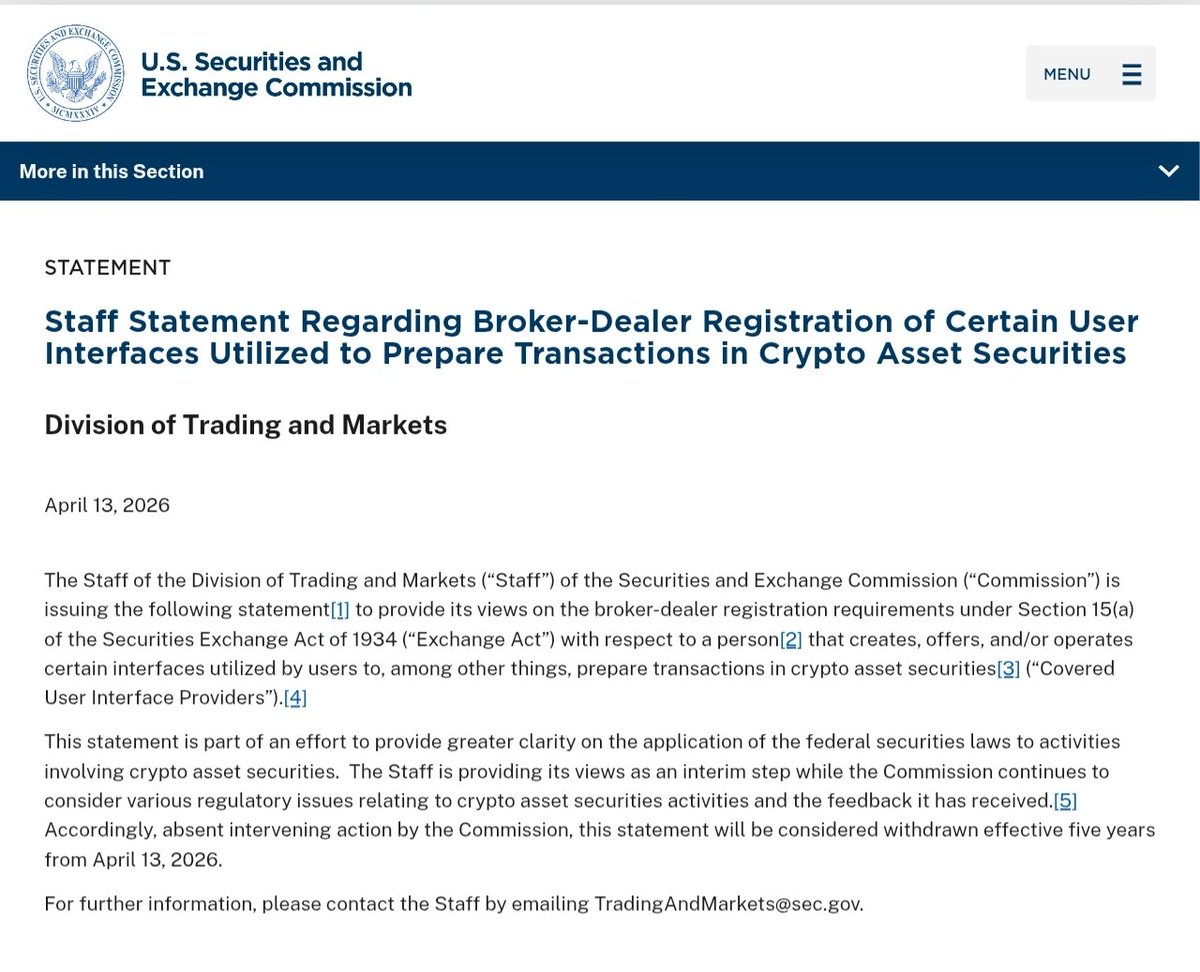 14th April 2026 – The SEC’s Division of Trading and Markets released a staff statement on April 13. It outlines when crypto trading interfaces can skip broker-dealer registration under Section 15 of the Exchange Act.