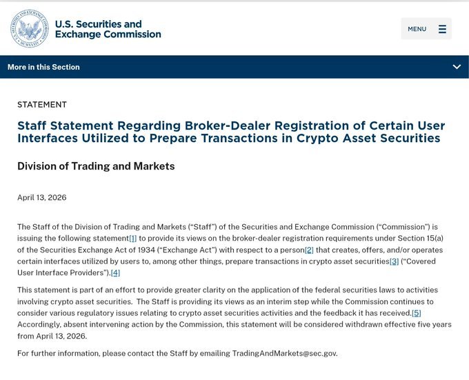 Enforcement risk drops for compliant interfaces. The statement also feeds into the SEC’s ongoing Crypto Task Force work. It could influence parallel CFTC guidance on derivatives interfaces as well.