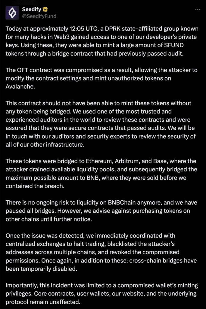 24th September 2025 – Seedify.fund, a Web3 gaming and metaverse launchpad, was hit by a major exploit on its bridge on September 23, 2025. Hackers targeted its cross-chain bridge, minting and dumping $1.2M worth of $SFUND. The exploit triggered a flash crash and 57–60% price drop, affecting 64,000 holders. Initial forensics suggest ties to a North Korean hacking group.